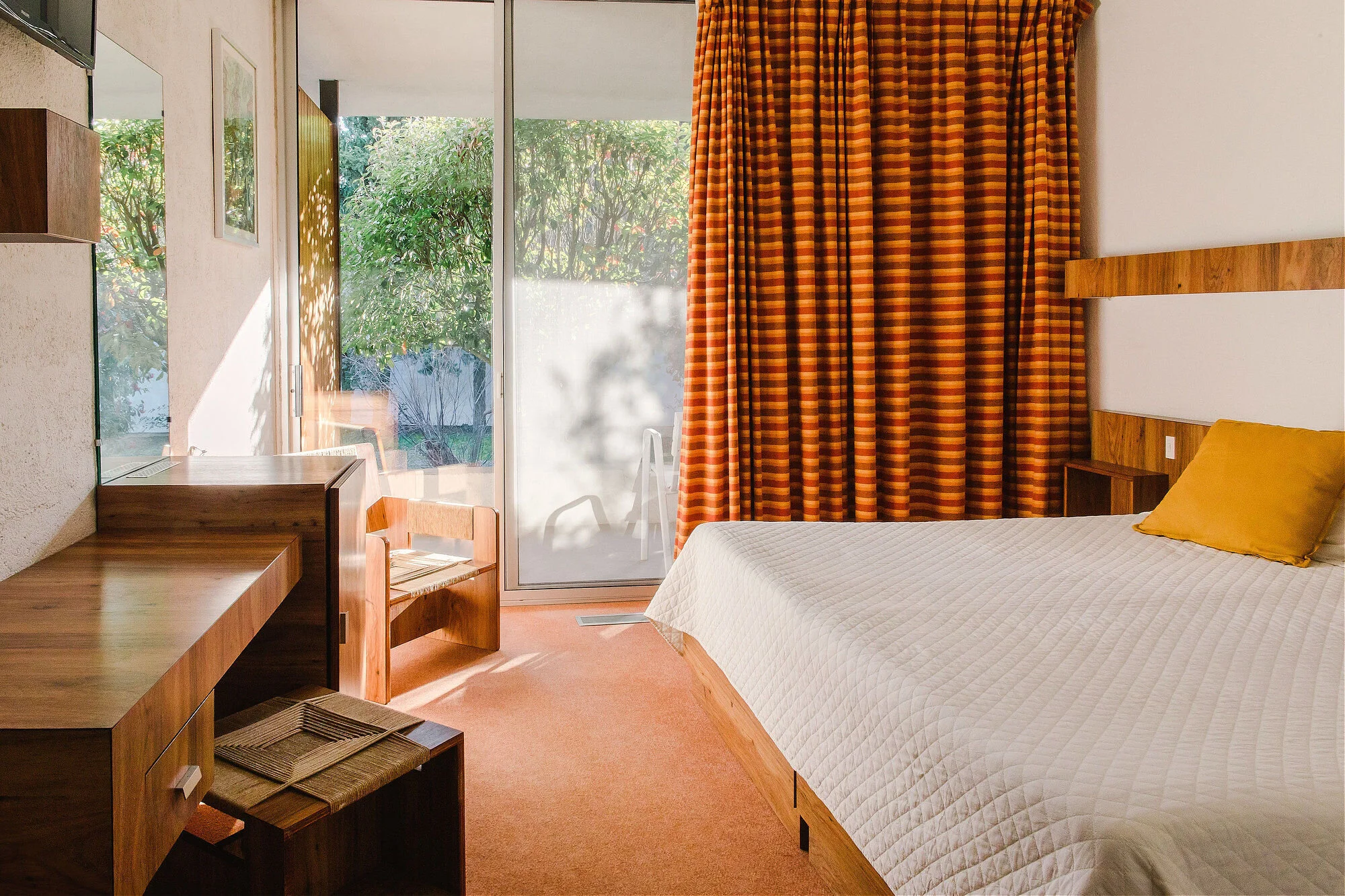 L'hôtel offre 29 chambres de plain-pied, disposant chacune d'une terrasse privée sans vis à vis et ouverte sur le patio. L'obscurité des couloirs de circulation qui conduisent à votre chambre, entre dans le concept de promenade architecturale qui fait passer le visiteur dans le registre de l'intime vers son "territoire personnel".